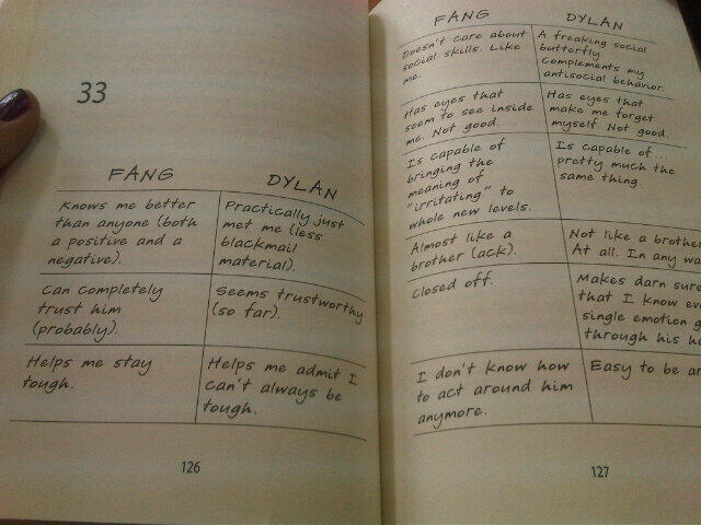 It goes on for two more pages. IS THIS NOT THE MOST BRILLIANT THING YOU'VE EVER SEEN??? This is what Max does instead of crying around like a lot of other YA heroines do these days. Now, imagine if the girls in all the other triangles made these lists between Edward and Jacob, Gale and Peeta, Will and Jem, Will and Cassian etc... (God, I could go on all day. That's not exactly a good thing.) ANYWAY, this list made my life. HUGE PROPS to Max for this. Goodness, I love her. So ya, Nevermore was amazing.